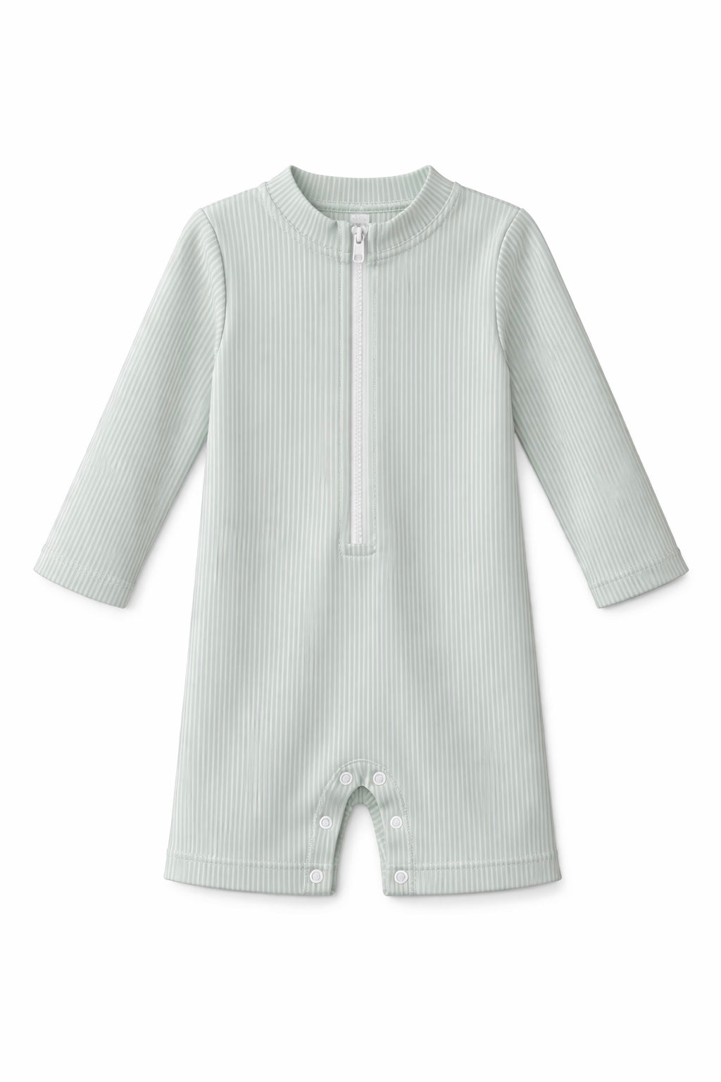 ThisUPF50+ anti-UV baby playsuitis specially designed to effectively protect toddlers' sensitive skin on sunny days. Practical for everyday wear at the beach, pool, or for outdoor activities, this romper (also calledbaby anti-UV suit) is equipped with along zip forto facilitate dressing and undressing, as well assnap buttons at the crotchallowing aquick diaper change.